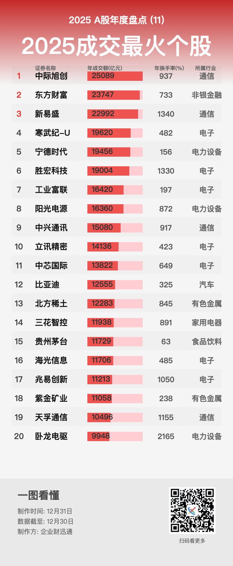 截至12月30日,中际旭创年内总成交额达2.51万亿元,日均成交约104亿元,成为A股年内成交最活跃个股,并刷新纪录,超过2015年中国平安的2.46万亿元。