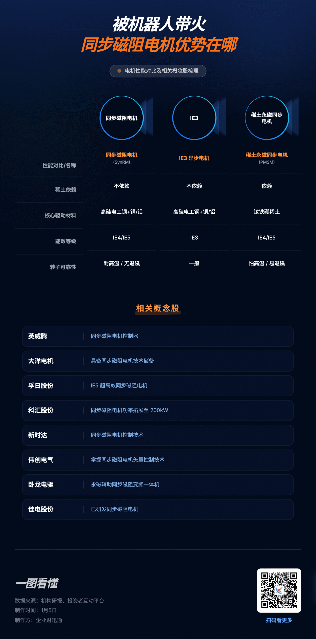 海通证券指出,特斯拉Optimus采用IPM-SynRM电机架构,将永磁同步电机与同步磁阻电机优势融合,低速具备永磁电机特性,高速下避免退磁问题,同时降低稀土材料使用和成本。