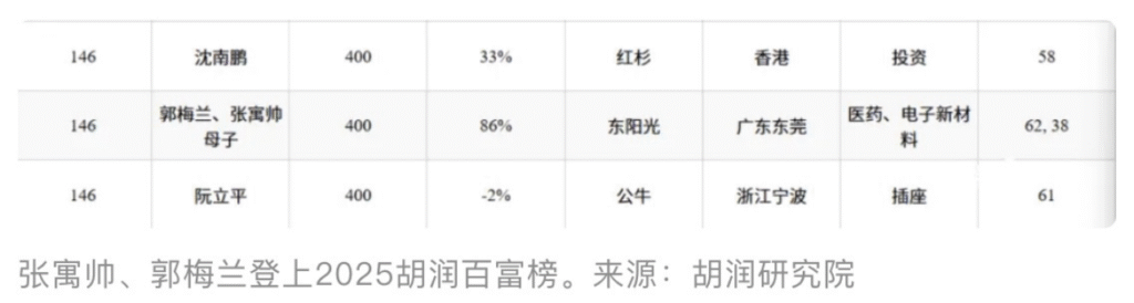 2020年11月,集团创始人、张寓帅的父亲张中能不幸病逝,成为张寓帅职业生涯的转折点。他继承了父亲持有的股份,临危受命,与母亲郭梅兰共同担任集团及上市公司的实际控制人,开启了为期五年的“试岗期”。这五年间,他稳住了公司基本面,并主导了一系列战略转型。2025年10月,郭梅兰、张寓帅母子以400亿元财富值登上胡润百富榜,位列第146位,成为新任“东莞首富”。如今,随着股权集中,张寓帅正式独掌大局,一个属于他的时代全面开启。