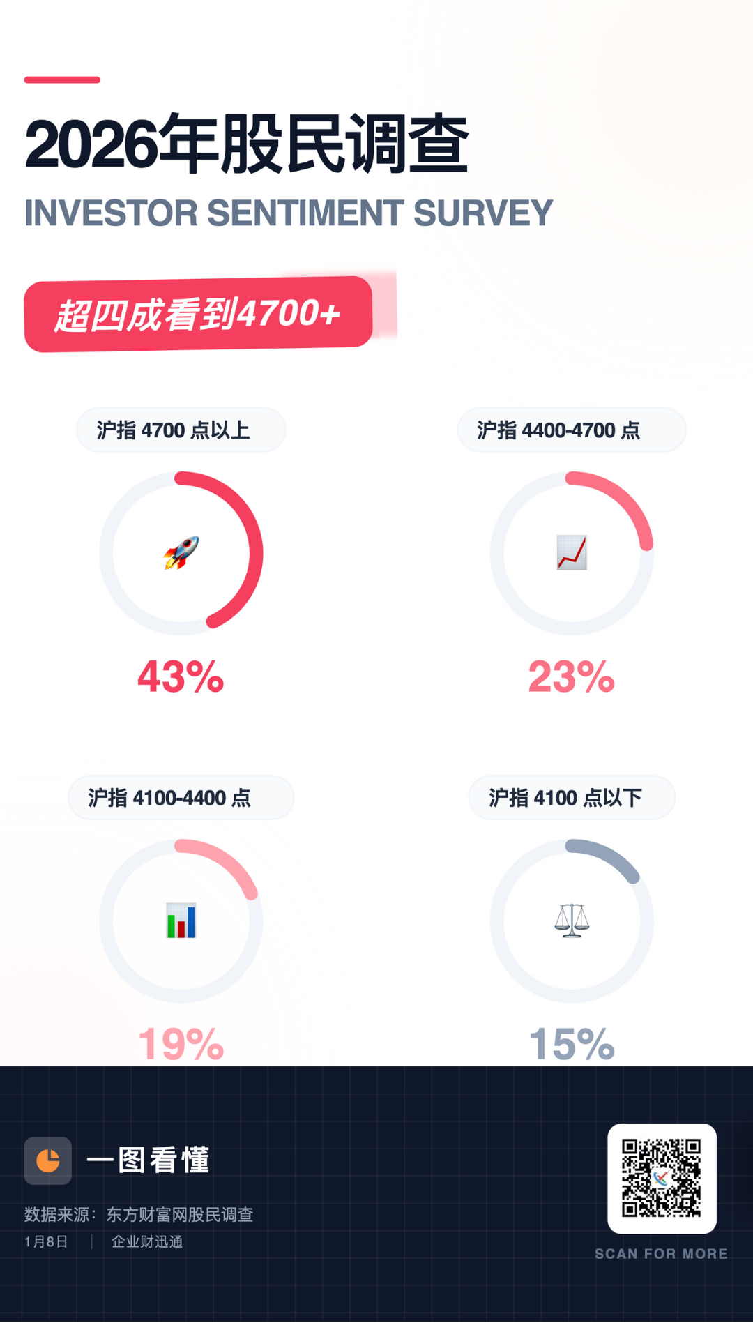 市场对2026年A股走势整体乐观。东方财富关于“2026年沪指高点”的调查显示,超4.8万名股民参与,其中约66%认为沪指高点将在4400点以上,43%甚至看至4700点以上。
