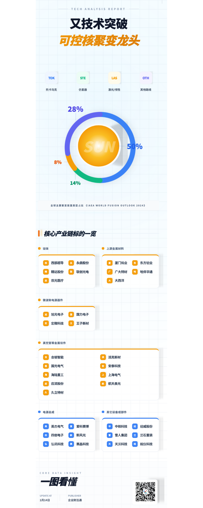 产业链方面,可关注超导磁体、真空室金属锻件、电源系统及微波器件等环节。中金公司认为,核聚变已被中国及美日英等国列为未来重点方向,产业正从实验走向工程化。机构预计,2030年全球核聚变市场规模接近5000亿美元,2050年有望突破万亿美元。