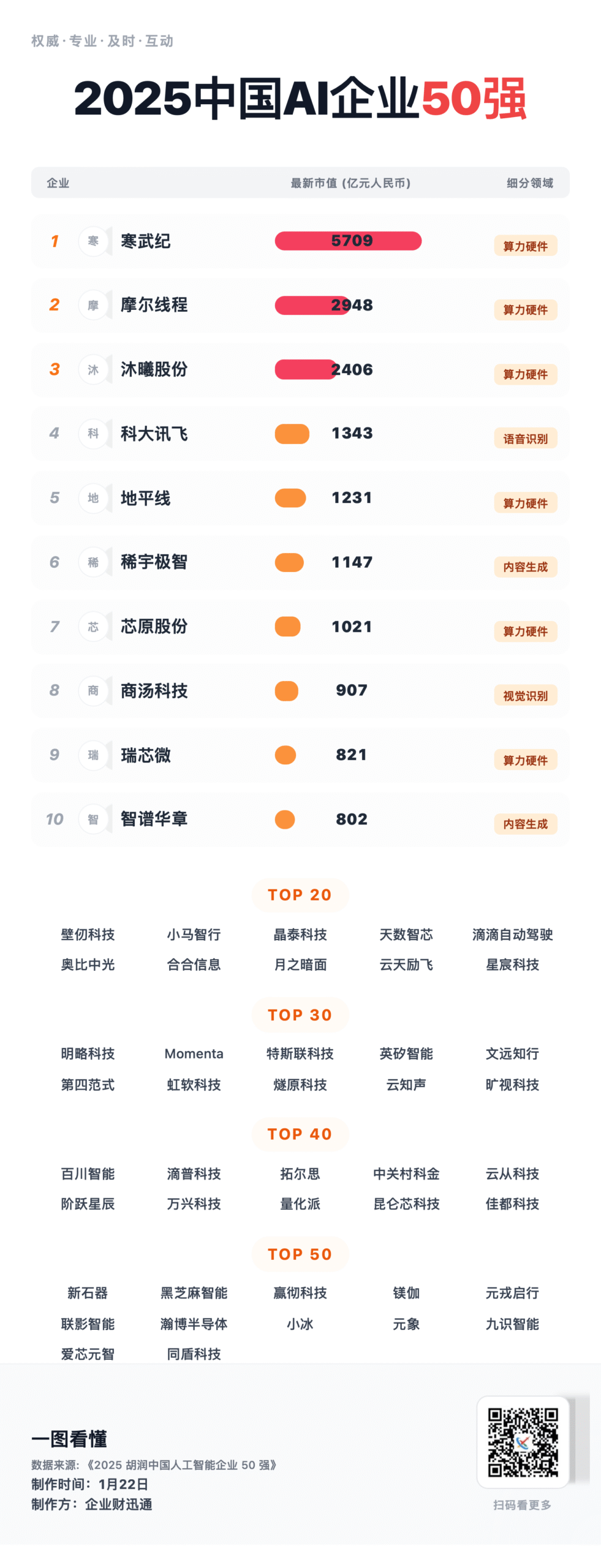 胡润研究院发布《2025 胡润中国人工智能企业 50 强》(实际收录 52 家,按企业价值排名,聚焦 AI 算力或算法主业)。