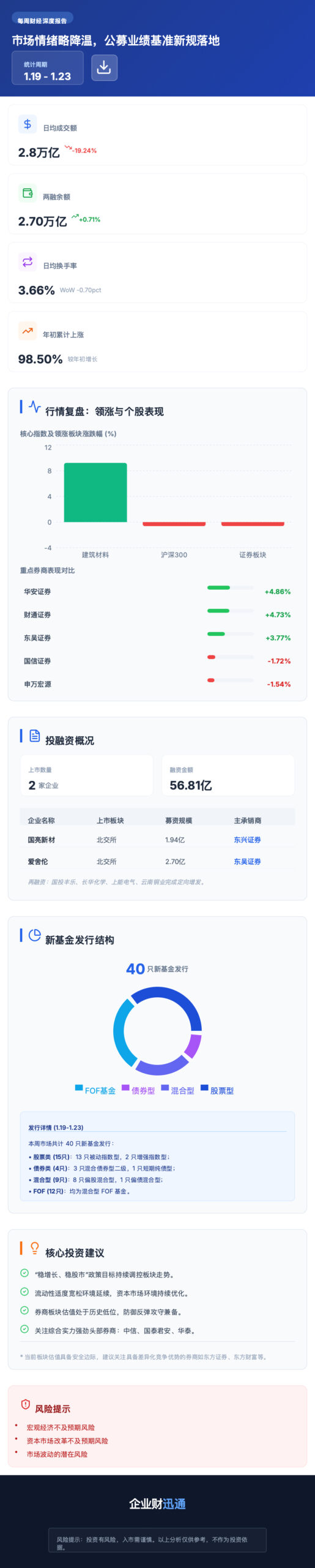 市场数据:本周 A 股日均成交 2.8 万亿元,环比下降 19.24%;两融余额环比上升 0.71%,达 2.70 万亿元;日均换手率 3.66%,环比下降 0.70 个百分点。