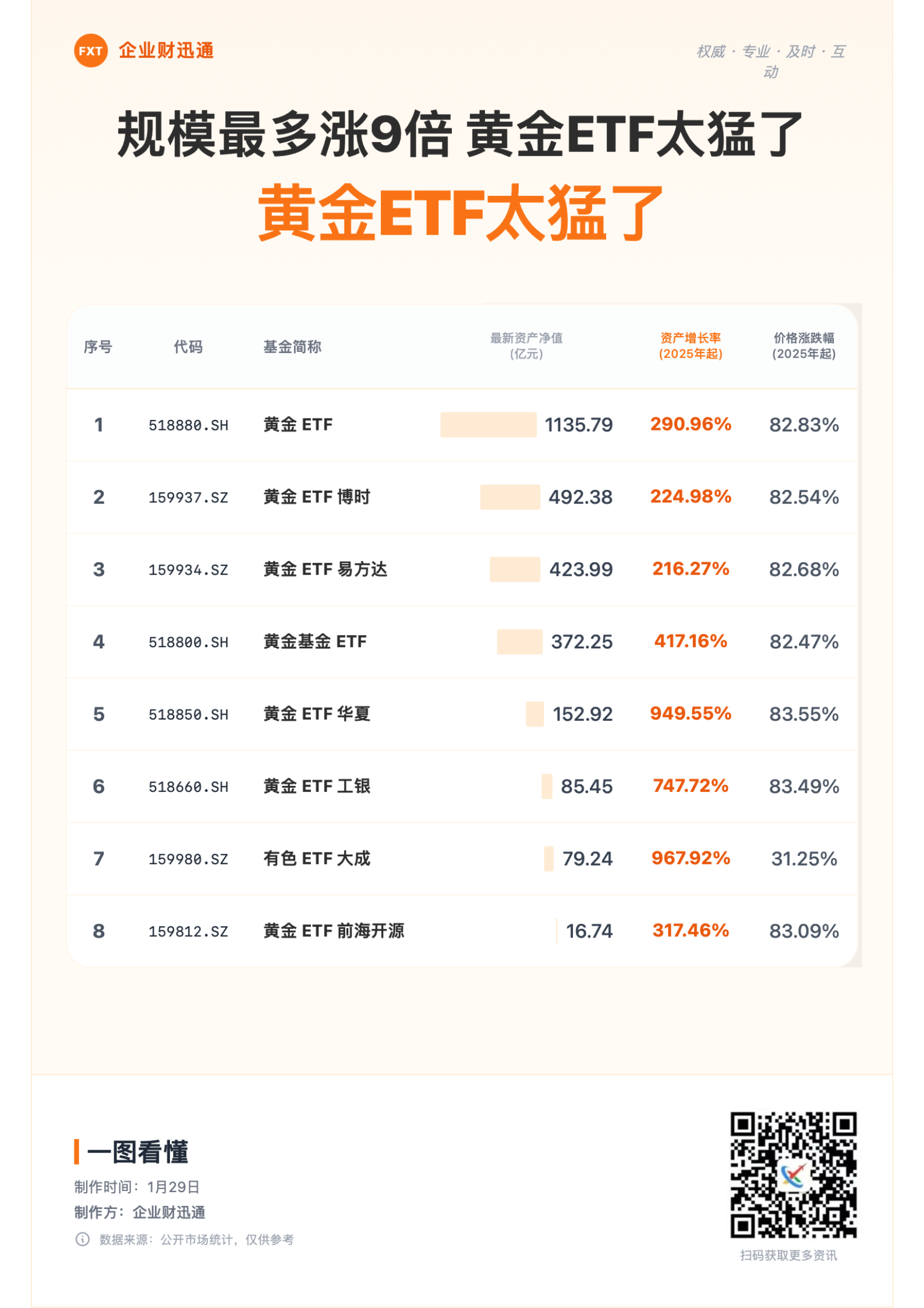 1月26日A股市场分化,黄金、有色金属板块受避险情绪及工业金属价格上行推动,掀起涨停潮,而前期热门题材出现回调。数据显示,当前市场共有8只相关基金,资产净值最高超千亿,最低约17亿元。今年以来,有色ETF大成与黄金ETF华夏规模增长均超9倍;除有色ETF大成外,其余相关ETF价格涨幅均超82%。