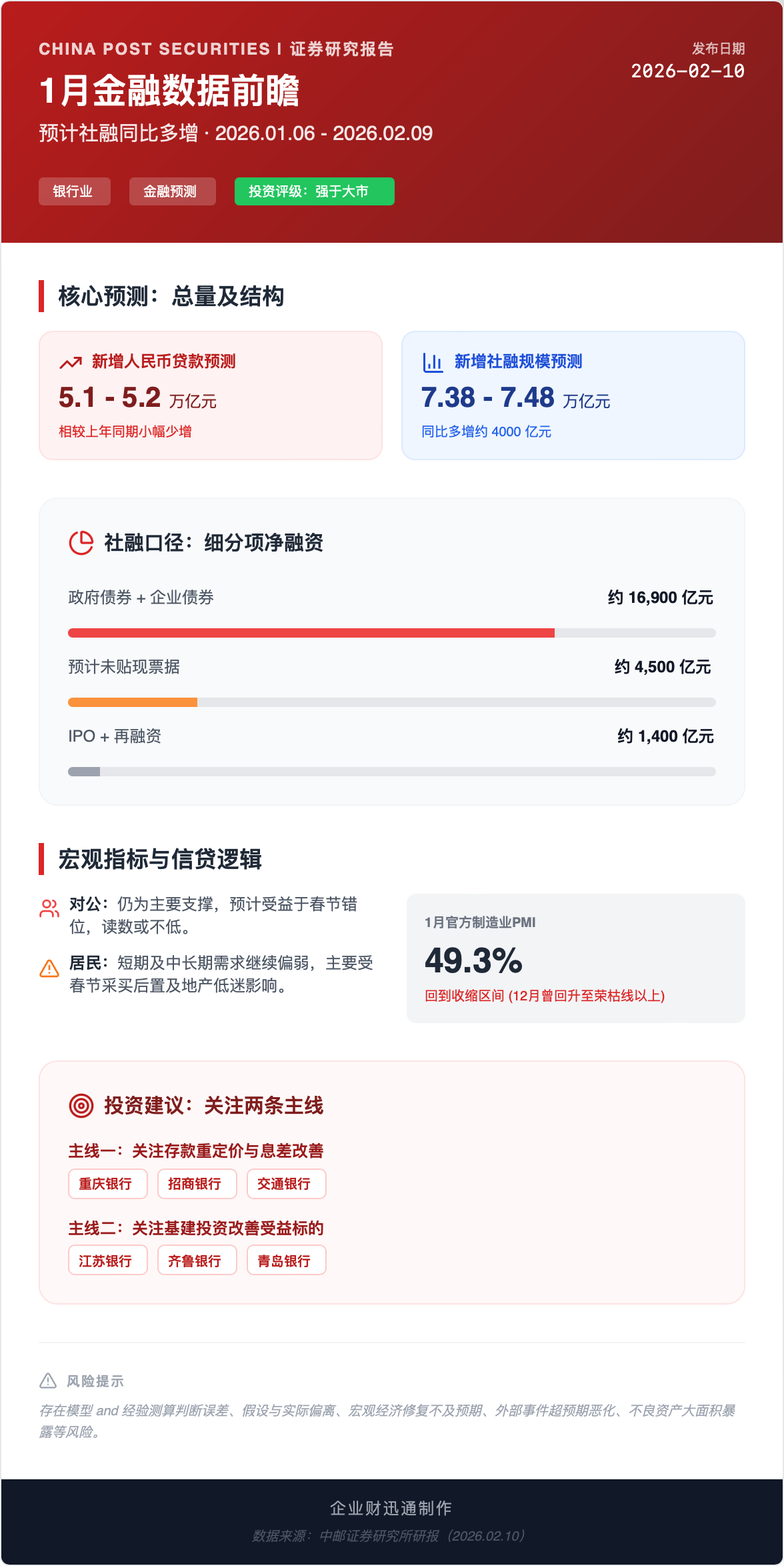 中邮证券 2026 年 2 月 10 日发布银行行业研报,维持行业 “强于大市” 评级,对 2026 年 1 月金融数据作出前瞻预测,预计当月社融同比多增,信贷则小幅少增,信贷结构呈现对公支撑、居民偏弱的特征。