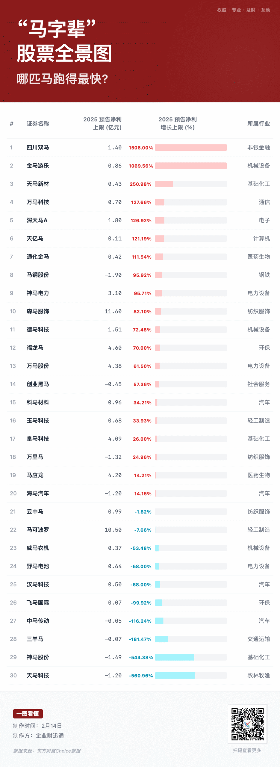 业绩增速:四川双马(1506%)、金马游乐(1069%)领跑,天马新材(251%)第三;20只预增,10只预减。