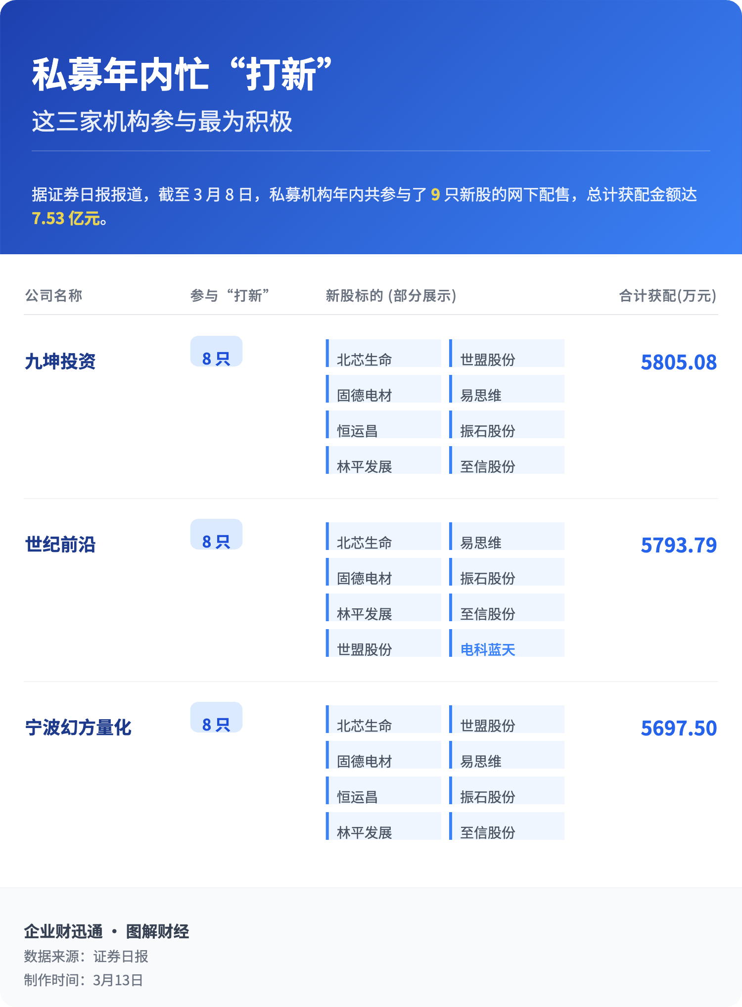 在百亿私募中,九坤投资参与最为积极,年内参与北芯生命、固德电材、恒运昌、林平发展、世盟股份、易思维、振石股份、至信股份等8只新股网下配售,合计获配179.06万股,获配金额5805.08万元。