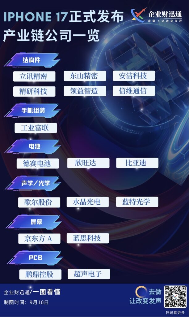 IPhone 17 正式发布,其产业链涉及结构件、手机组装、电池等多个领域,众多公司参与其中。