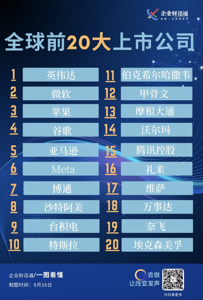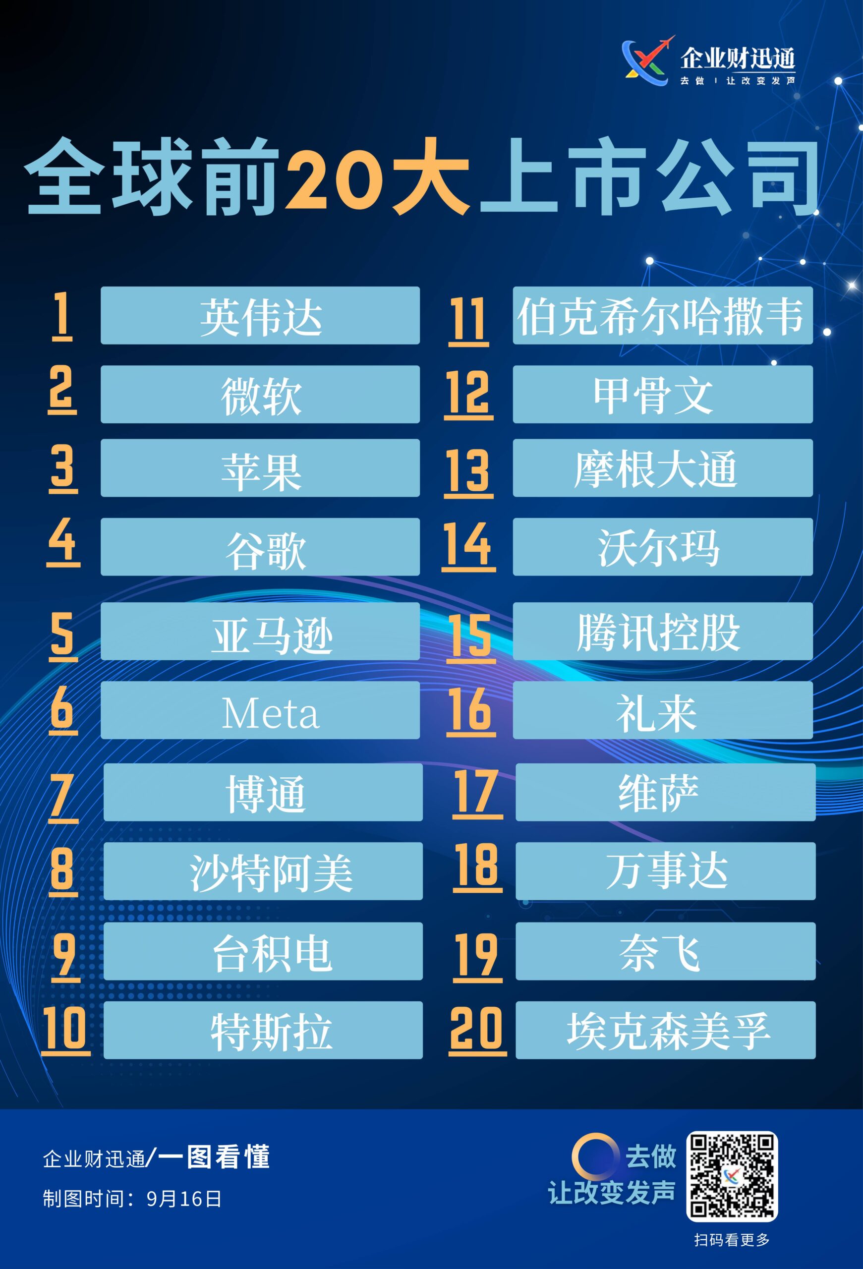 全球前 20 大上市公司涵盖科技、金融、能源等多领域,英伟达位居榜首。其中腾讯控股是唯一上榜的中国企业,展现出中国企业在全球的影响力。