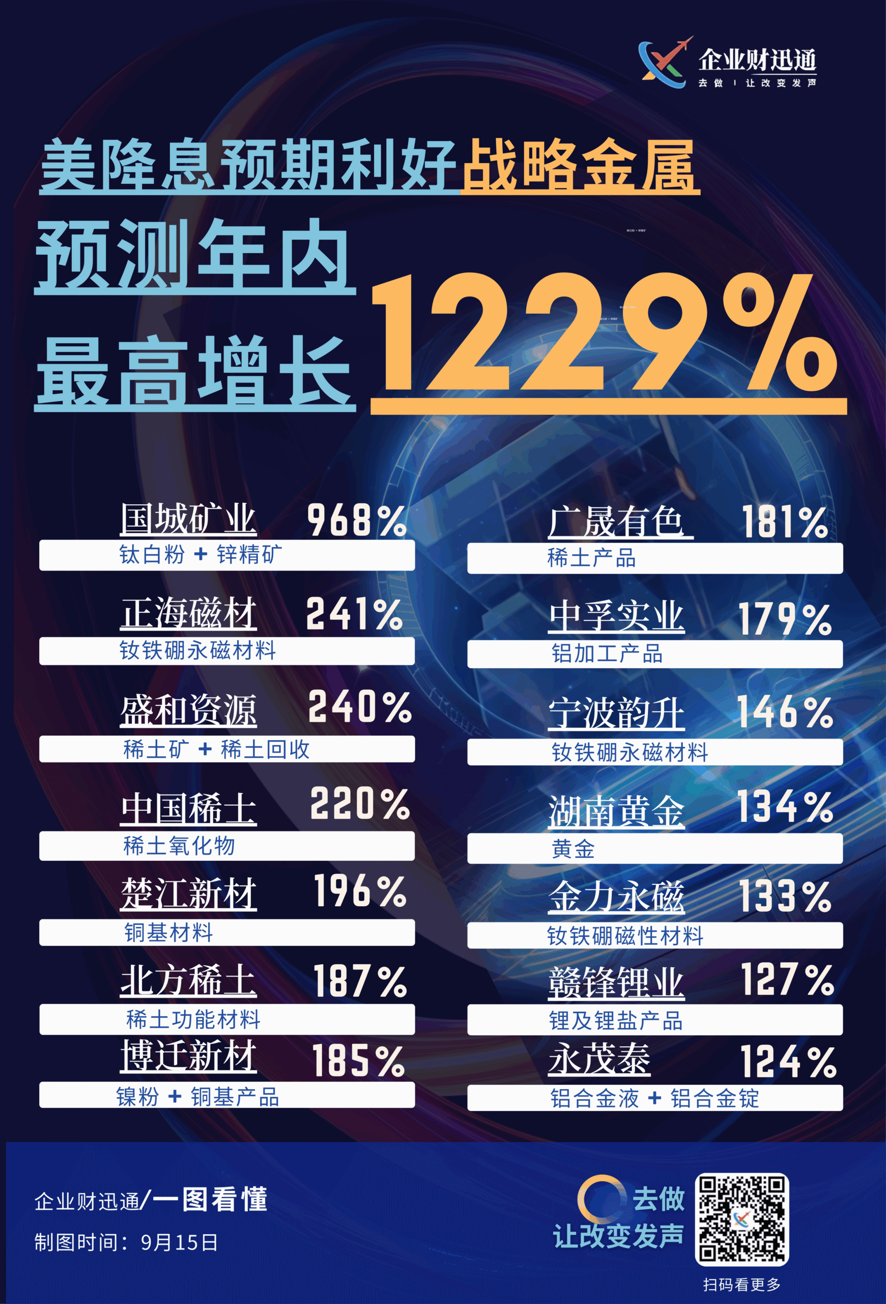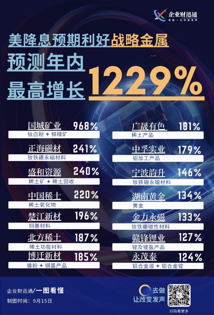 受美国降息预期影响,战略金属行业迎来利好,预测年内最高增长达 1229%。国城矿业、正海磁材等多家涉及稀土、钛、锂等金属相关业务的企业,预计将有较高增长幅度。
