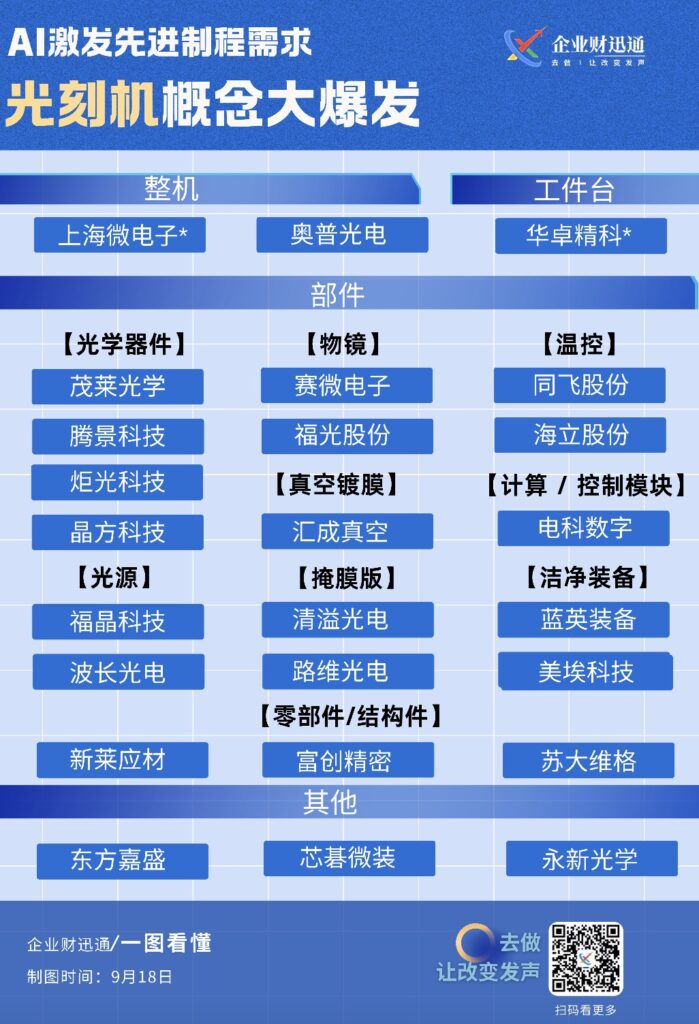 在 AI 激发先进制程需求的背景下,光刻机概念迎来大爆发,涉及整机(上海微电子 *、奥普光电等)、工件台(华卓精科 * 等)、部件(涵盖光学器件、物镜、温控、光源、真空镀膜、计算 / 控制模块、掩膜版、洁净装备、零部件 / 结构件等多个细分领域,对应茂莱光学、赛微电子、同飞股份等众多企业)以及其他(东方嘉盛、芯碁微装、永新光学等)相关企业。