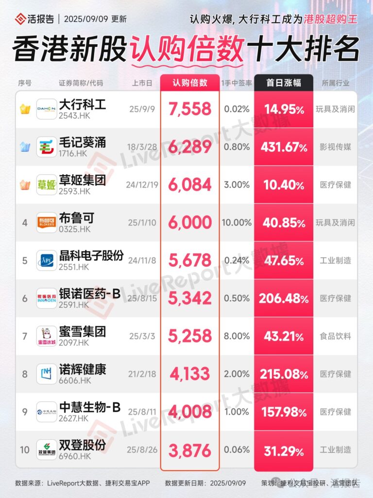 大行科工以 7558 倍的认购倍数成为港股超购王,首日涨幅 14.95%;毛记葵涌、草姬集团等企业也上榜,涉及玩具及消闲、影视传媒、医疗保健等多个行业,这些新股普遍首日涨幅可观。