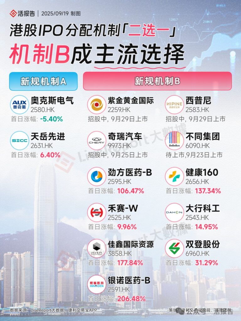 港股 IPO 分配有 “二选一” 机制,机制 B 成主流选择;采用机制 A 的奥克斯电气首日涨幅 – 5.40%,天岳先进首日涨幅 6.40%;采用机制 B 的企业中,银诺医药 – B 首日涨幅 206.48%,健康 160 首日涨幅 137.34% 等,还有部分企业处于招股或待上市阶段。