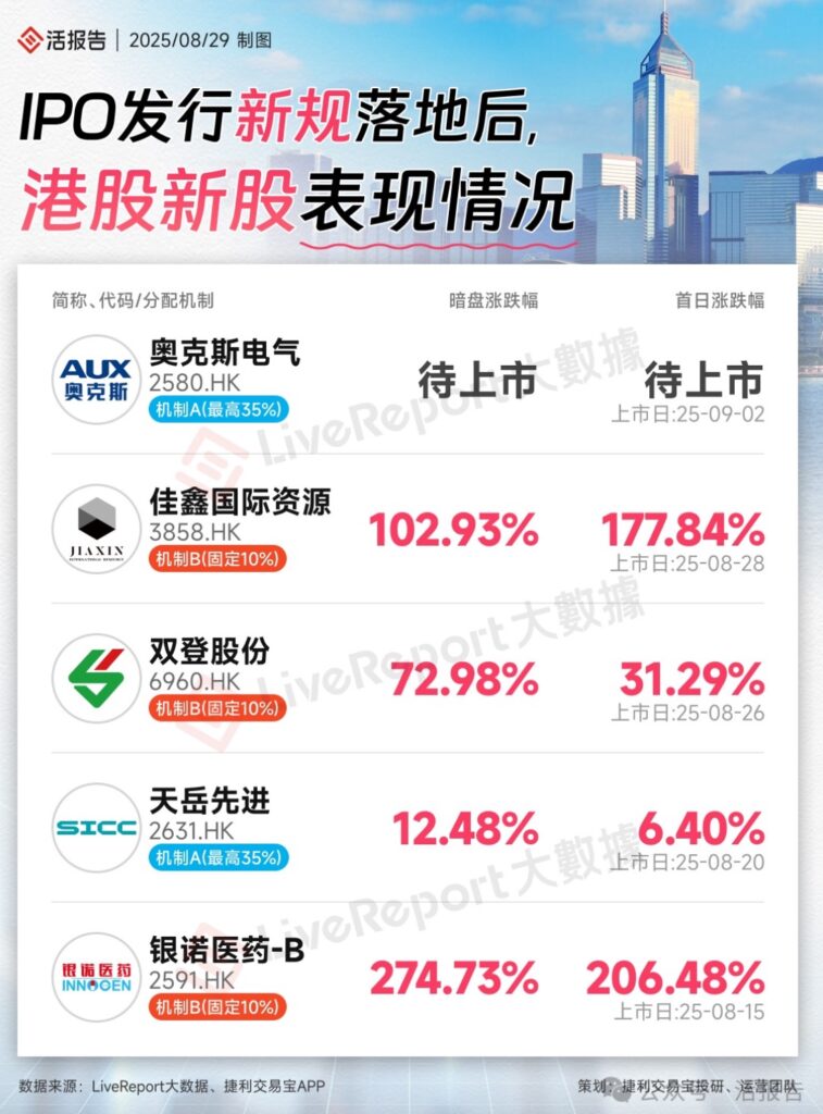 IPO 发行新规落地后,港股新股呈现不同表现。佳鑫国际资源、银诺医药 – B 等多只新股暗盘和首日均有大幅上涨,佳鑫国际资源首日涨幅达 177.84%,银诺医药 – B 暗盘涨 274.73%、首日涨 206.48%;双登股份、天岳先进也有一定涨幅;奥克斯电气则待上市。