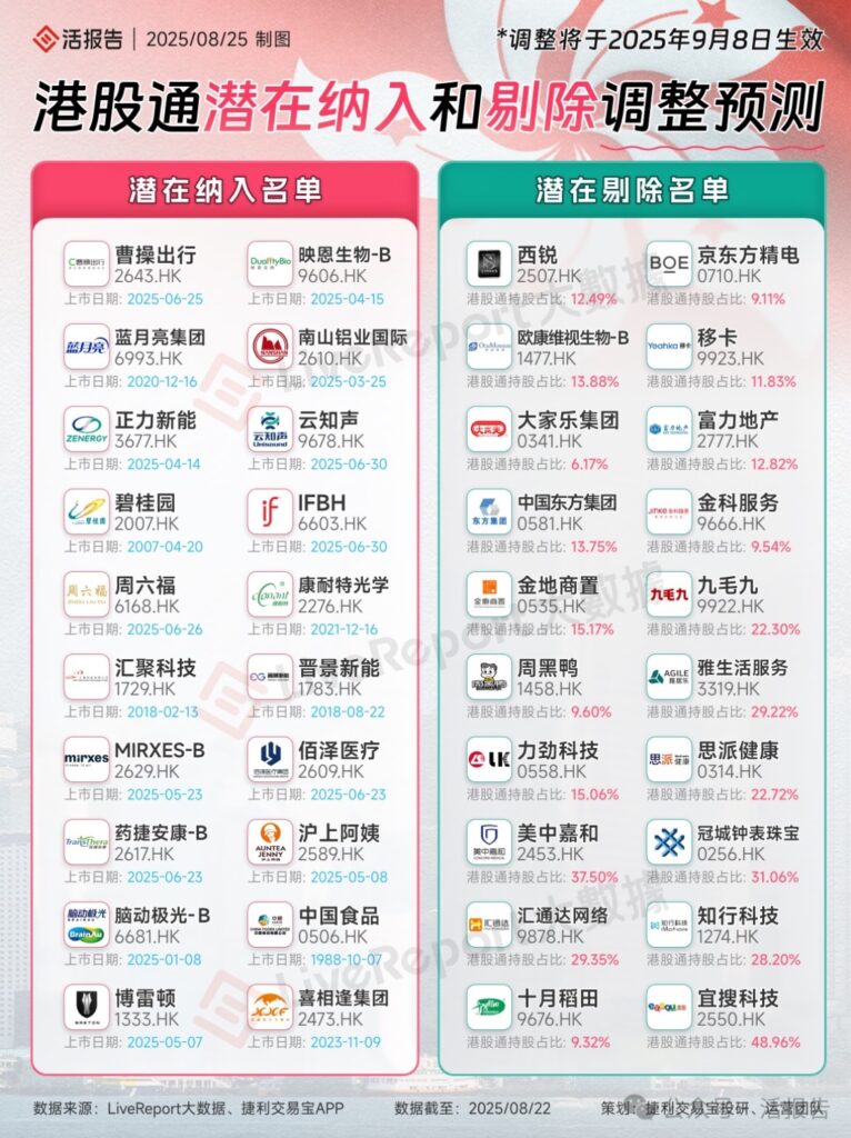 港股通潜在纳入和剔除调整预测,此次调整将于 2025 年 9 月 8 日生效。潜在纳入名单涵盖曹操出行、蓝月亮集团等多只个股;潜在剔除名单涉及西锐、京东方精电等,同时标注了相关个股的港股通持股占比等信息, 图片数据来源:活报告