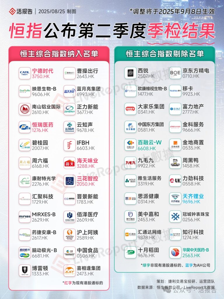 恒指公布第二季度季检结果,调整将于 2025 年 9 月 8 日生效。内容分为恒生综合指数纳入名单和剔除名单,纳入名单中有宁德时代、曹操出行等多只个股,剔除名单包含西锐、京东方精电等个股。 图片数据来源:活报告
