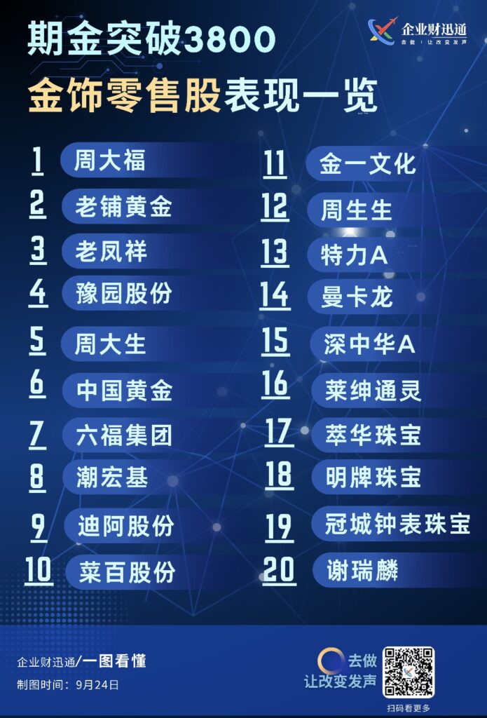 核心聚焦 “期金突破 3800” 这一市场关键节点,专门呈现金饰零售板块相关个股的表现情况,具体涵盖了 20 只金饰零售领域的个股(如周大福、老铺黄金、老凤祥等,均为该板块具有代表性或关注度较高的标的),通过罗列个股名称,直观关联期金价格突破重要关口后的板块关联标的,为用户快速定位该市场背景下的金饰零售股范围提供参考,其内容导向偏向于辅助关注黄金市场与相关零售企业联动的投资者或市场研究者,快速获取核心关联个股信息。