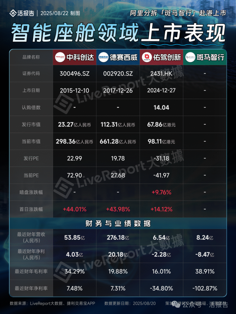 智能座舱领域中中科创达、德赛西威、佑驾创新和斑马智行的上市表现及财务业绩数据,涵盖各品牌的证券代码、上市日期、认购倍数、市值、PE(市盈率)、涨跌幅,还有最近财年的营收、净利、毛利率、净利率等信息,以展现不同企业在该领域的发展状况,数据更新至 2025 年 8 月 20 日,同时涵盖阿里分拆 “斑马智行” 赴港上市的情况。