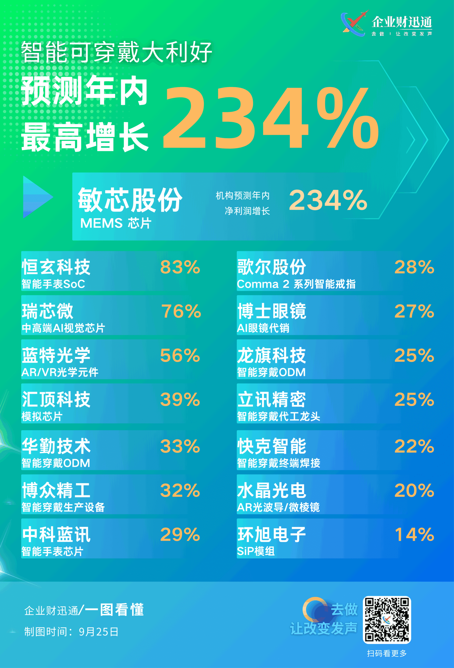 聚焦智能可穿戴领域,相关企业受此利好影响,机构预测年内净利润有不同程度增长。其中敏芯股份(MEMS 芯片)预测增长最高,达 234%;恒玄科技(智能手表 SoC)、瑞芯微(中高端 AI 视觉芯片)等企业也有较高增长,还有歌尔股份(Comma 2 系列智能戒指)、博士眼镜(AI 眼镜代销)等多家企业均有一定幅度增长,体现出了智能可穿戴产业对相关企业业绩的带动作用。