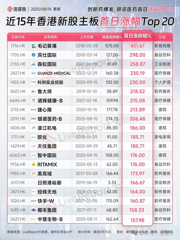 近15 年香港新股主板首日涨幅排名前 20 的股票情况。榜单涵盖了不同行业,像影视传媒、食品饮料、医疗保健等。其中,毛记葵涌首日涨幅达 431.67%,位居榜首;银诺医药 – B 首日涨超 206%,表现亮眼,数据反映了不同时期香港新股市场的活跃程度与各行业新股的表现情况。