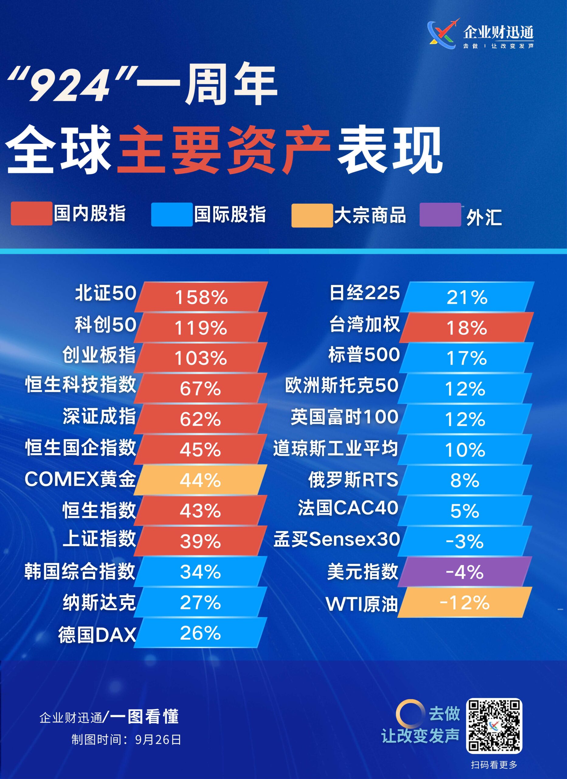 “924” 一周年全球主要资产的表现,涵盖国内股指、国际股指、大宗商品、外汇等类别。国内股指中北证 50 涨幅达 158% 居前,国际股指里日经 225 涨 21% 表现较好;大宗商品方面 COMEX 黄金涨 44%,而 WTI 原油跌 12%;外汇中美元指数跌 4%,整体展现出各类资产在该时段的涨跌情况。