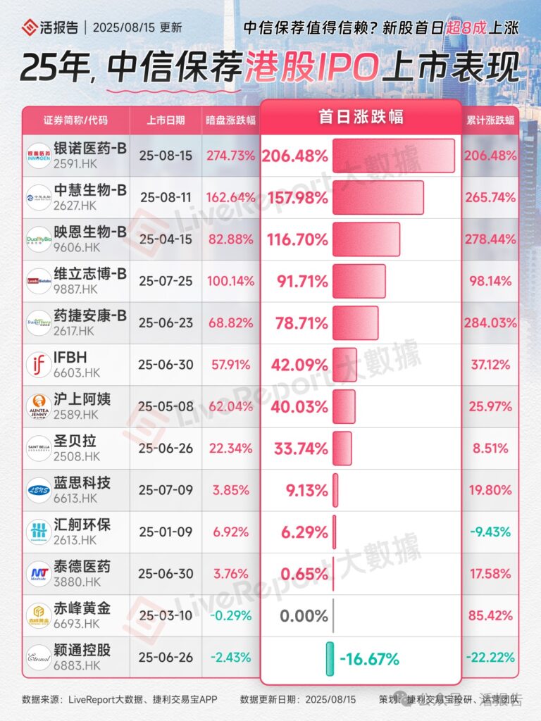 中信保荐港股 IPO 的上市表现,涵盖多只港股的证券简称、代码、上市日期、暗盘涨跌幅、首日涨跌幅及累计涨跌幅等信息,其中新股首日超 8 成上涨,像银诺医药 – B 首日涨幅达 206.48%,不过也有部分股票首日下跌,如颖通控股首日跌幅为 16.67%。
