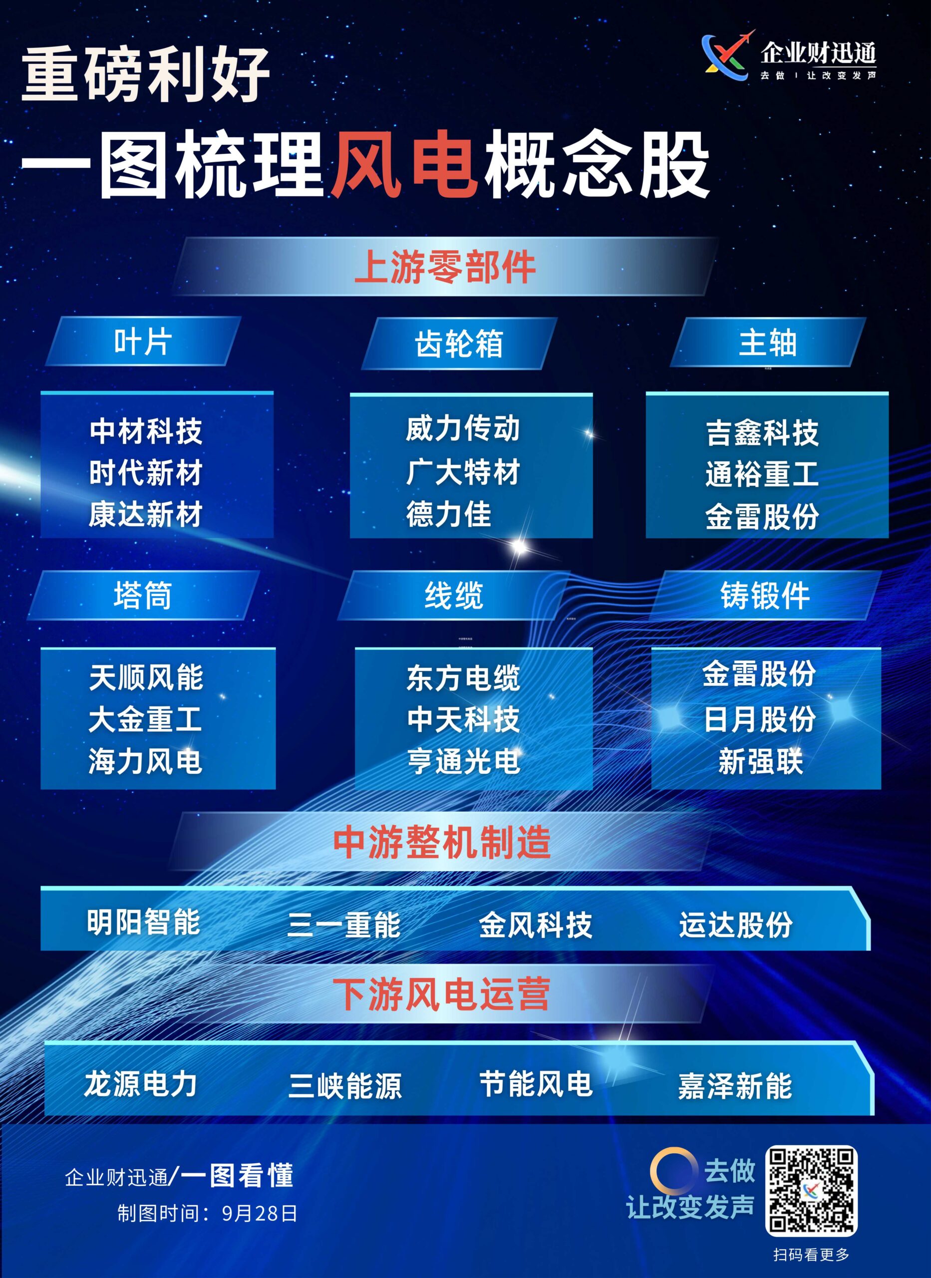 关于风电概念股的梳理,从上游零部件(包含叶片、齿轮箱、主轴、塔筒、线缆、铸锻件等细分领域及对应企业)、中游整机制造(如明阳智能、三一重能等企业)、下游风电运营(如龙源电力、三峡能源等企业)三个环节,介绍相关的风电概念上市公司。